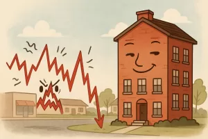 Conceptual illustration of a peaceful landscape at sunrise with stylized multifamily buildings, symbolizing the stability and calm of passive real estate investing.